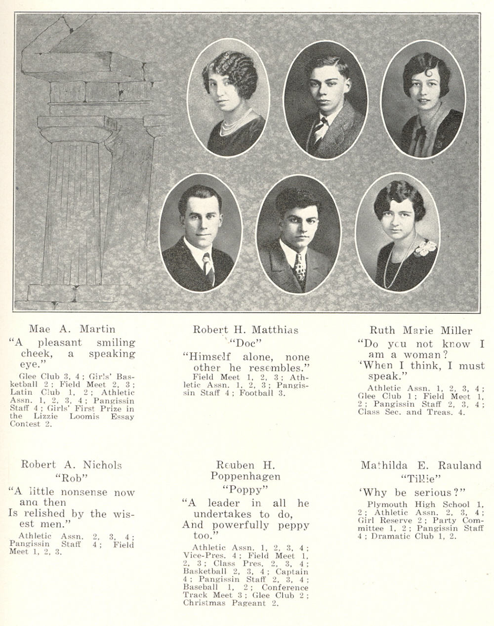 1928 Sheboygan Falls High School, Page 17: Mae Martin, Robert Matthias, Ruth Miller, Robert Nichols, Reuben Poppenhagen, Mathilda Rauland.