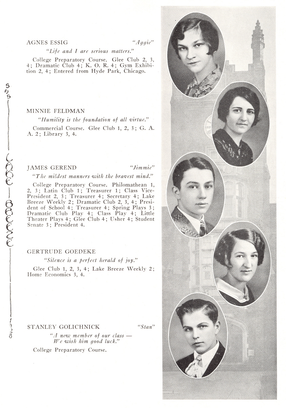 1928 Sheboygan High School, Page 19: Agnes Essig, Minnie Feldman, James Gerend, Gertrude Goedeke, Stanley Golichnick.