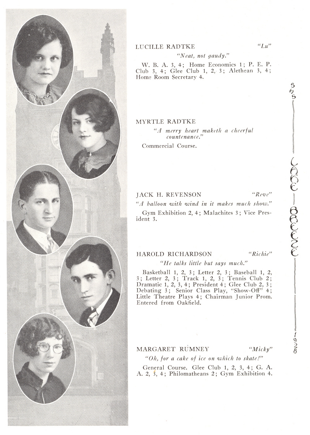 1928 Sheboygan High School, Page 28: Lucille Radtke, Myrtle Radtke, Jack Revenson, Harold Richardson, Margaret Rumney.