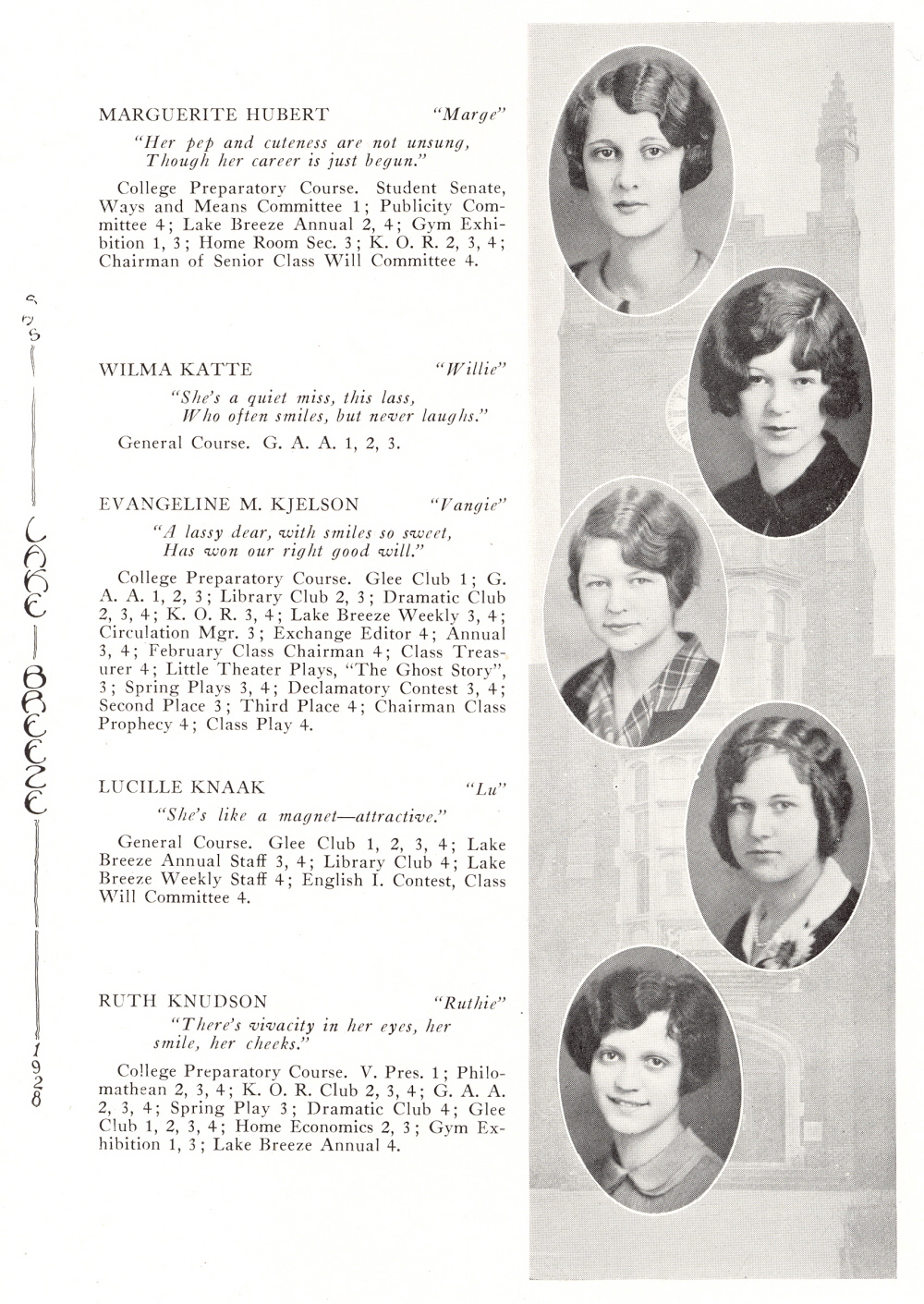 1928 Sheboygan High School, Page 6: Marguerite Hubert, Wilma Katte, Evangeline Kjelson, Lucille Knaak, Ruth Knudson.