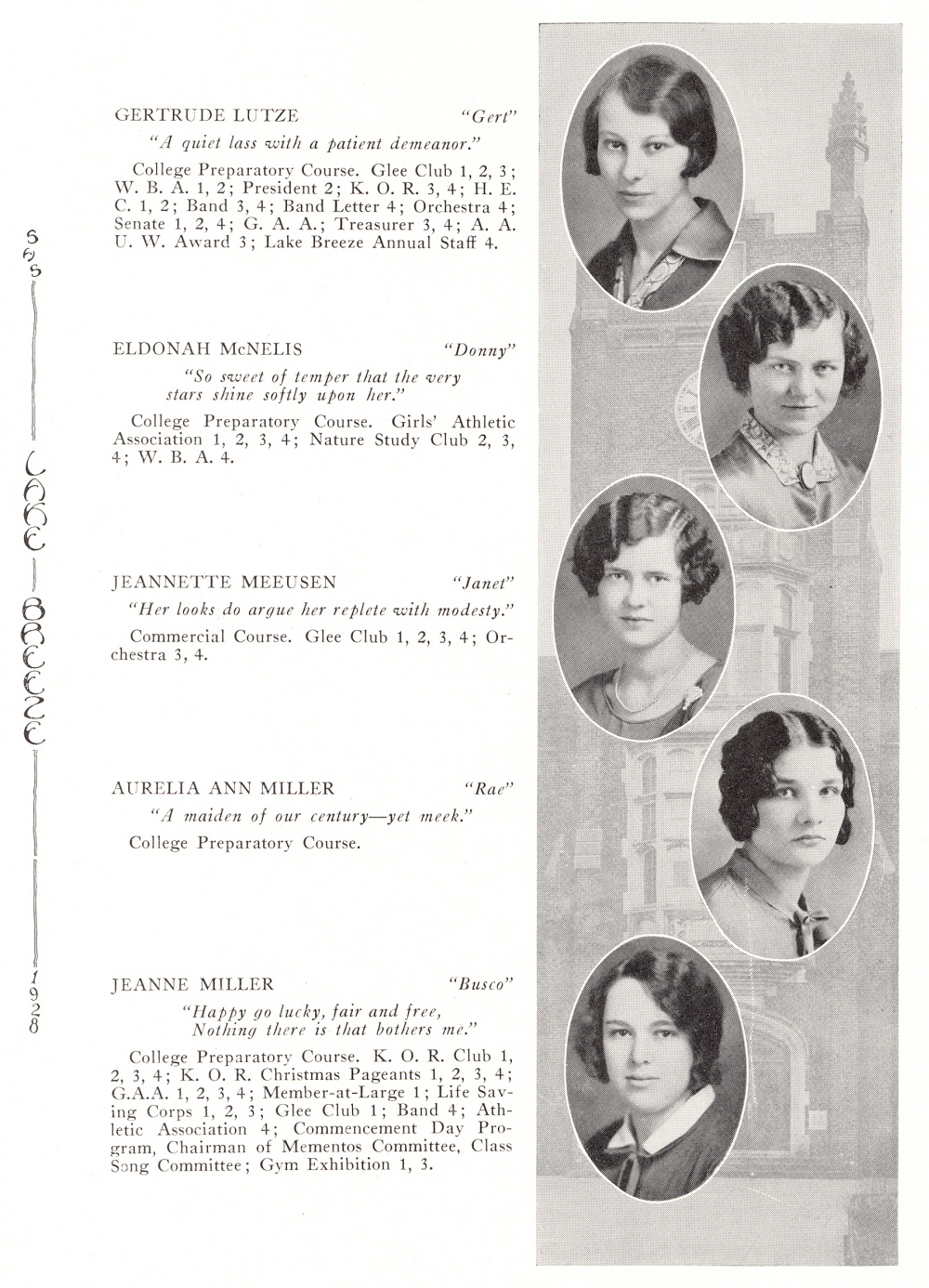 1928 Sheboygan High School, Page 8: Gertrude Lutze, Eldonah McNelis, Jeannette Meeusen, Aurelia Miller, Jeanne Miller.