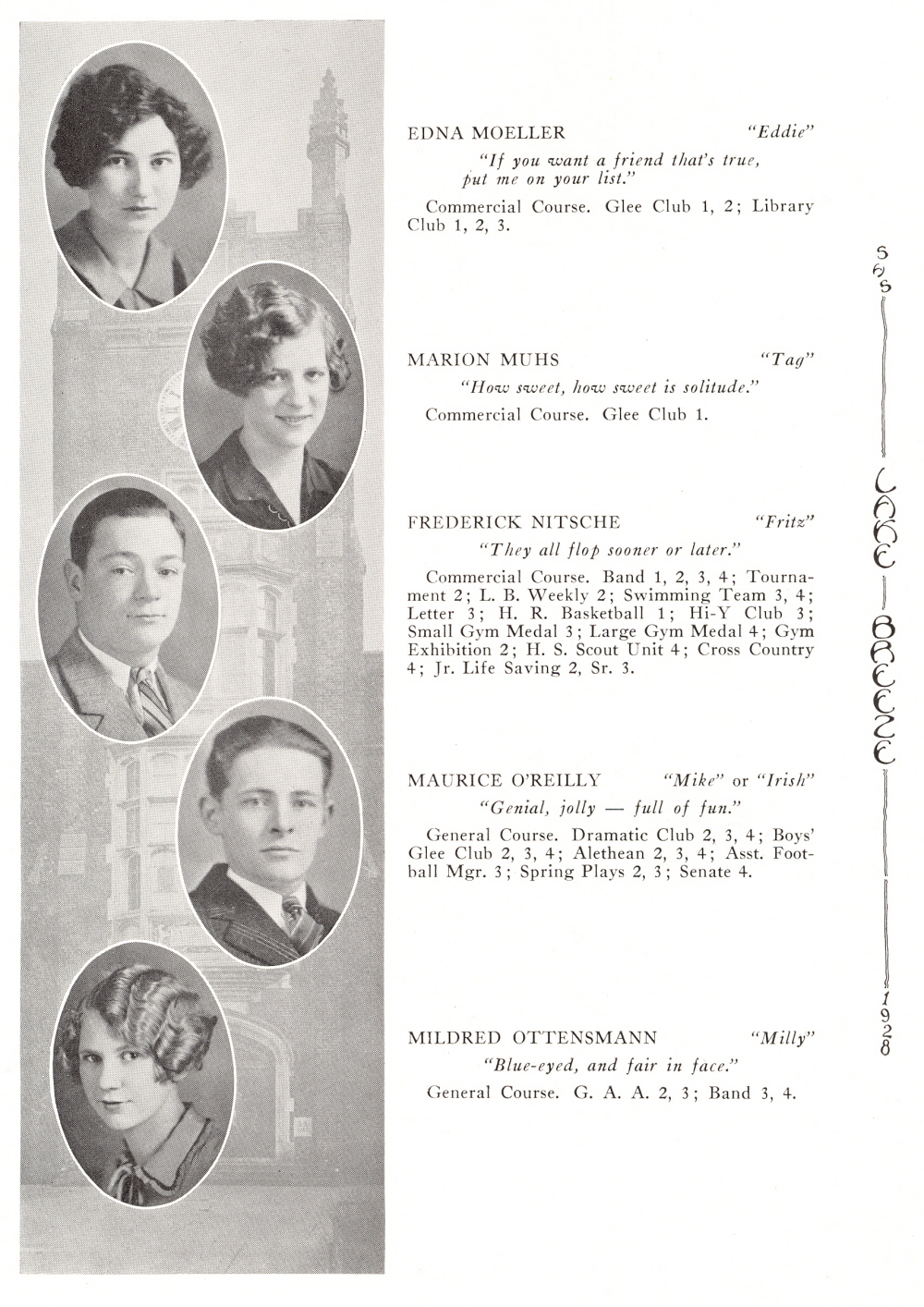 1928 Sheboygan High School, Page 9: Edna Moeller, Marion Muhs, Frederick Nitsche, Maurice O'Reilly, Mildred Ottensmann.