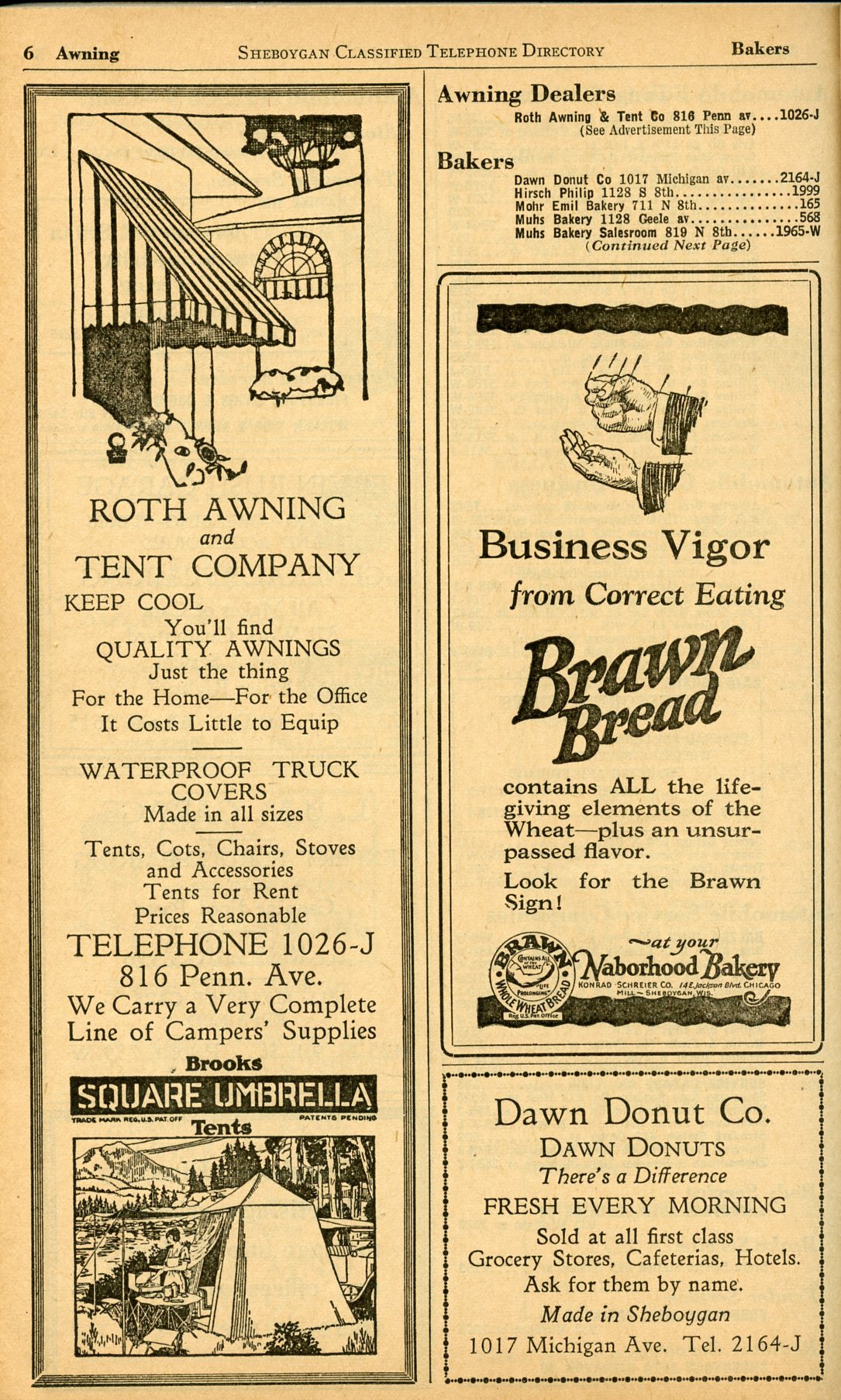 1928 Sheboygan Telephone Book, Page 102, Business Section: Awning Dealers to Bakers