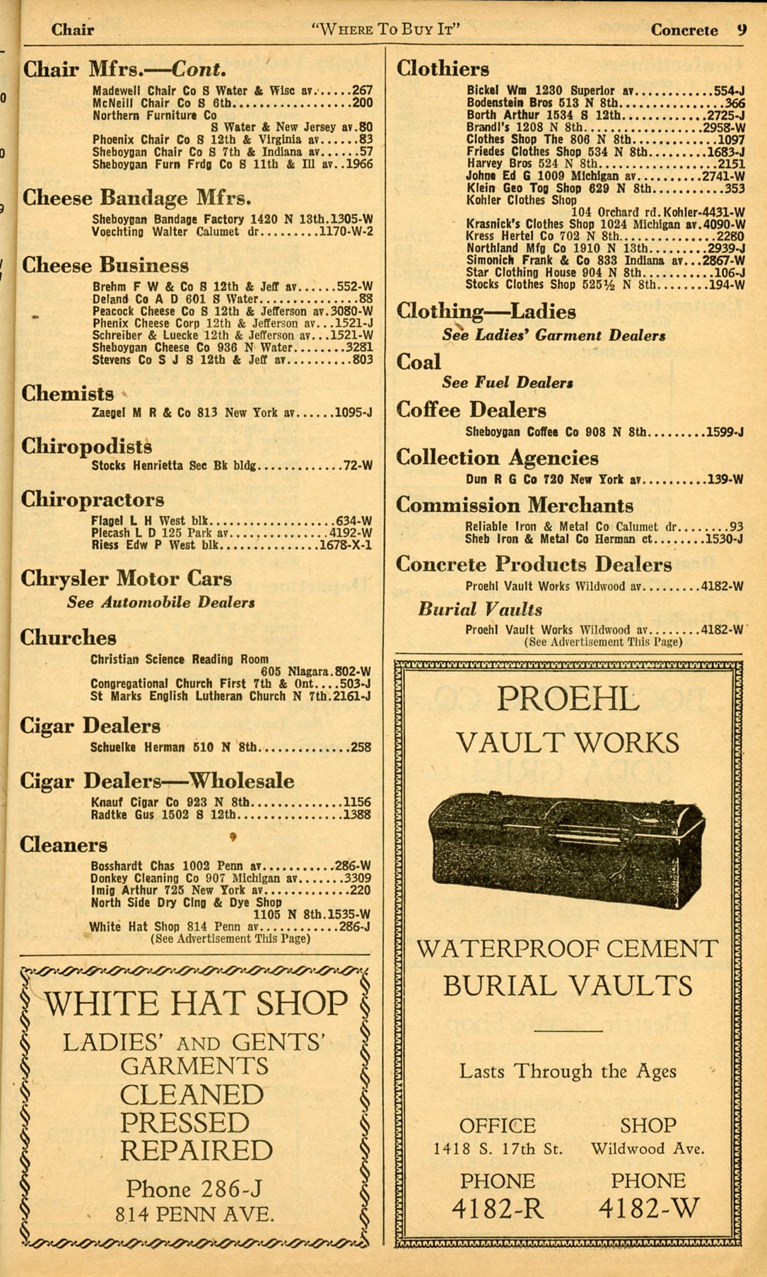 1928 Sheboygan Telephone Book, Page 105, Business Section: Chair Manufacturers to Concrete Products Dealers