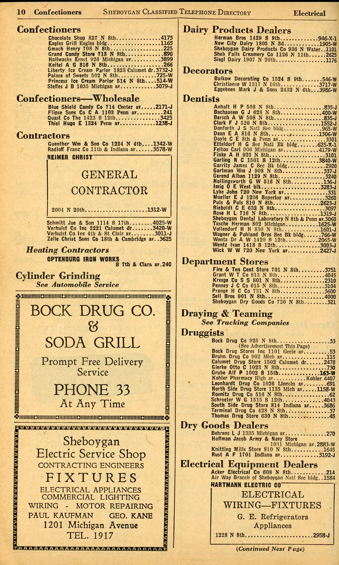 1928 Sheboygan Telephone Book, Page 106, Business Section: Confectioners to Electrical Equipment Dealers