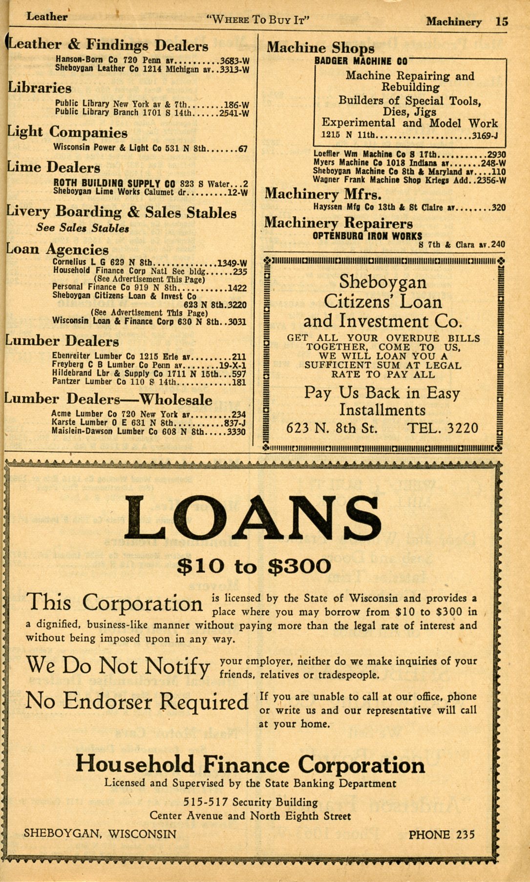 1928 Sheboygan Telephone Book, Page 111, Business Section: Leather & Findings Dealers to Machinery Repairers