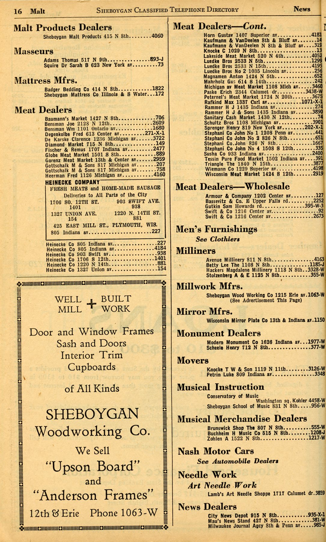 1928 Sheboygan Telephone Book, Page 112, Business Section: Malt Products Dealers to News Dealers