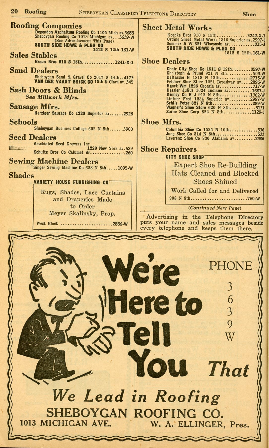 1928 Sheboygan Telephone Book, Page 116, Business Section: Roofing Companies to Shoe Repairers