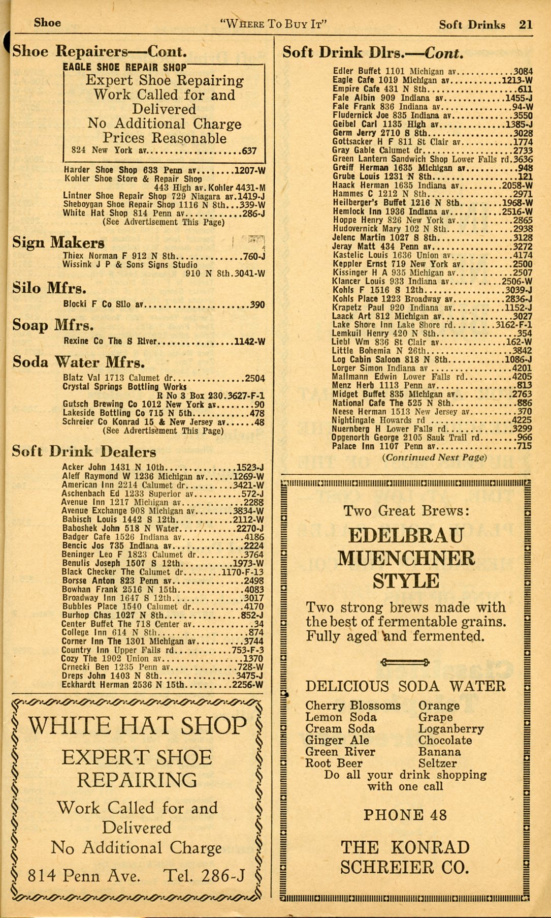 1928 Sheboygan Telephone Book, Page 117, Business Section: Shoe Repairers to Soft Drink Dealers