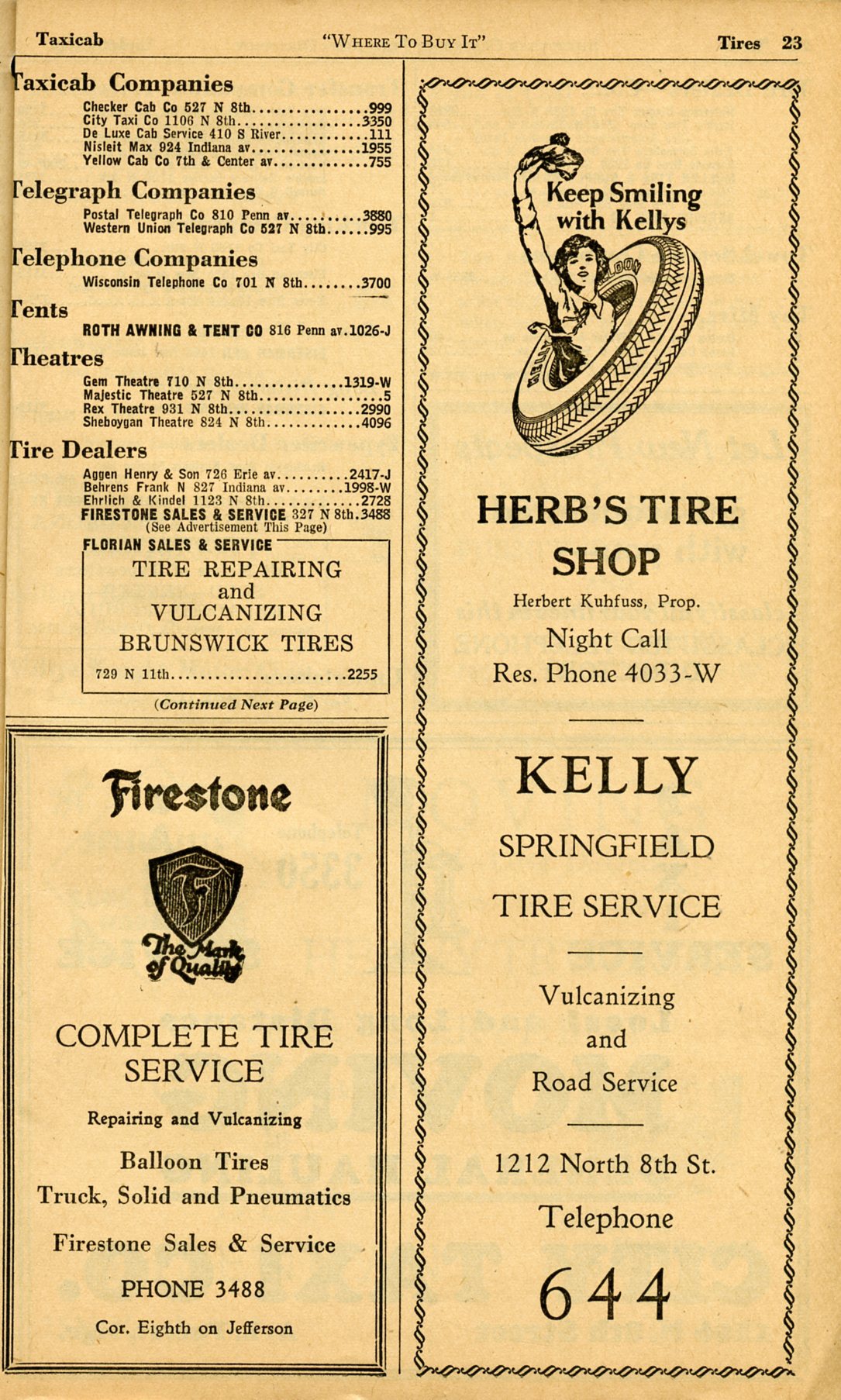 1928 Sheboygan Telephone Book, Page 119, Business Section: Taxicab Companies to Tire Dealers