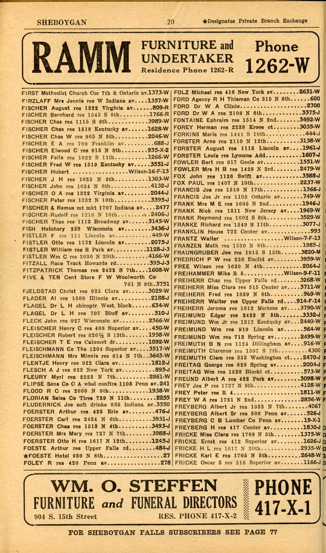1928 Sheboygan Telephone Book, Page 20: First to Fricke