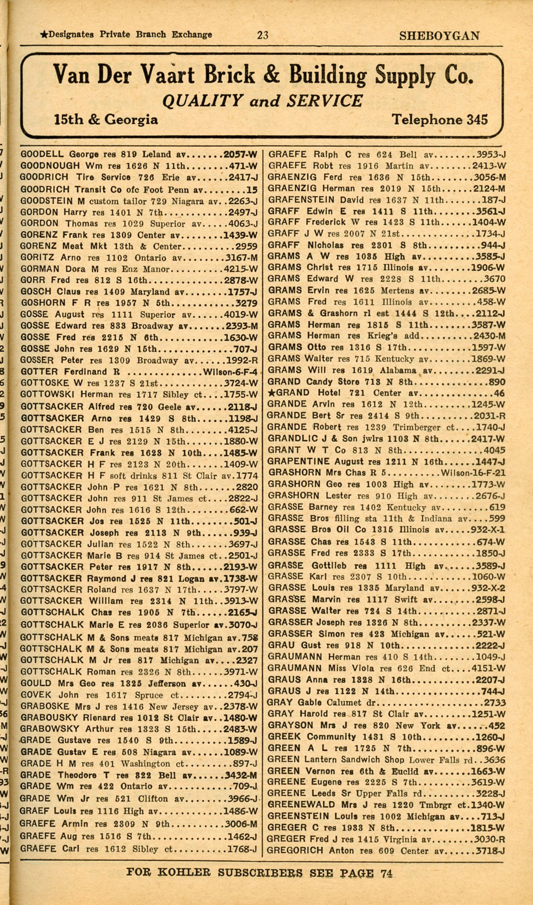 1928 Sheboygan Telephone Book, Page 23: Goodell to Gregorich