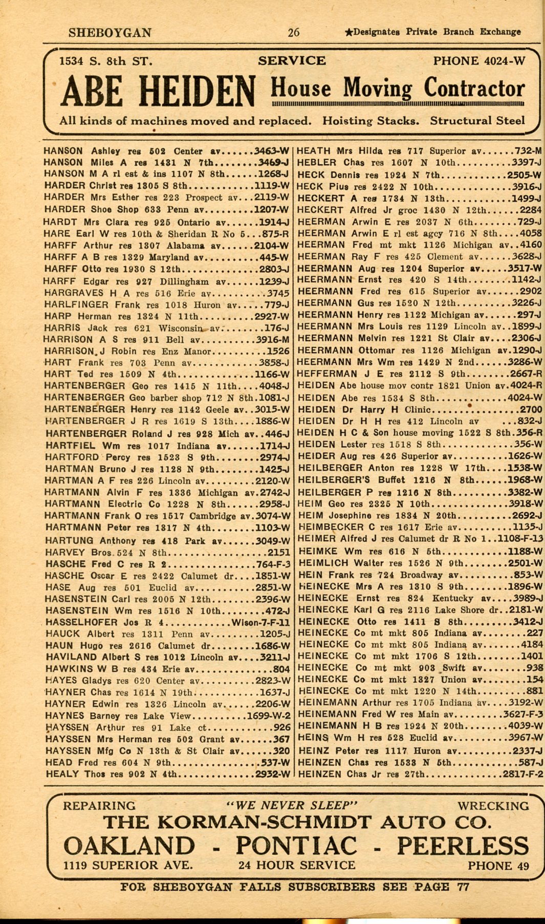 1928 Sheboygan Telephone Book, Page 26: Hanson to Heinzen