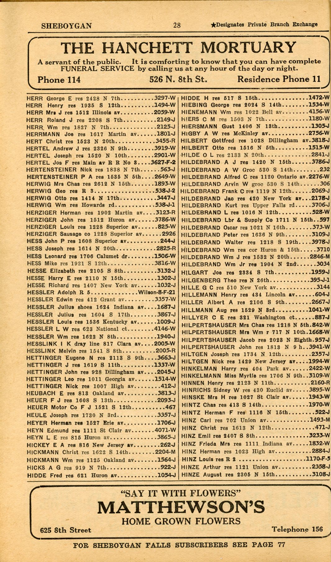 1928 Sheboygan Telephone Book, Page 28: Herr to Hinze