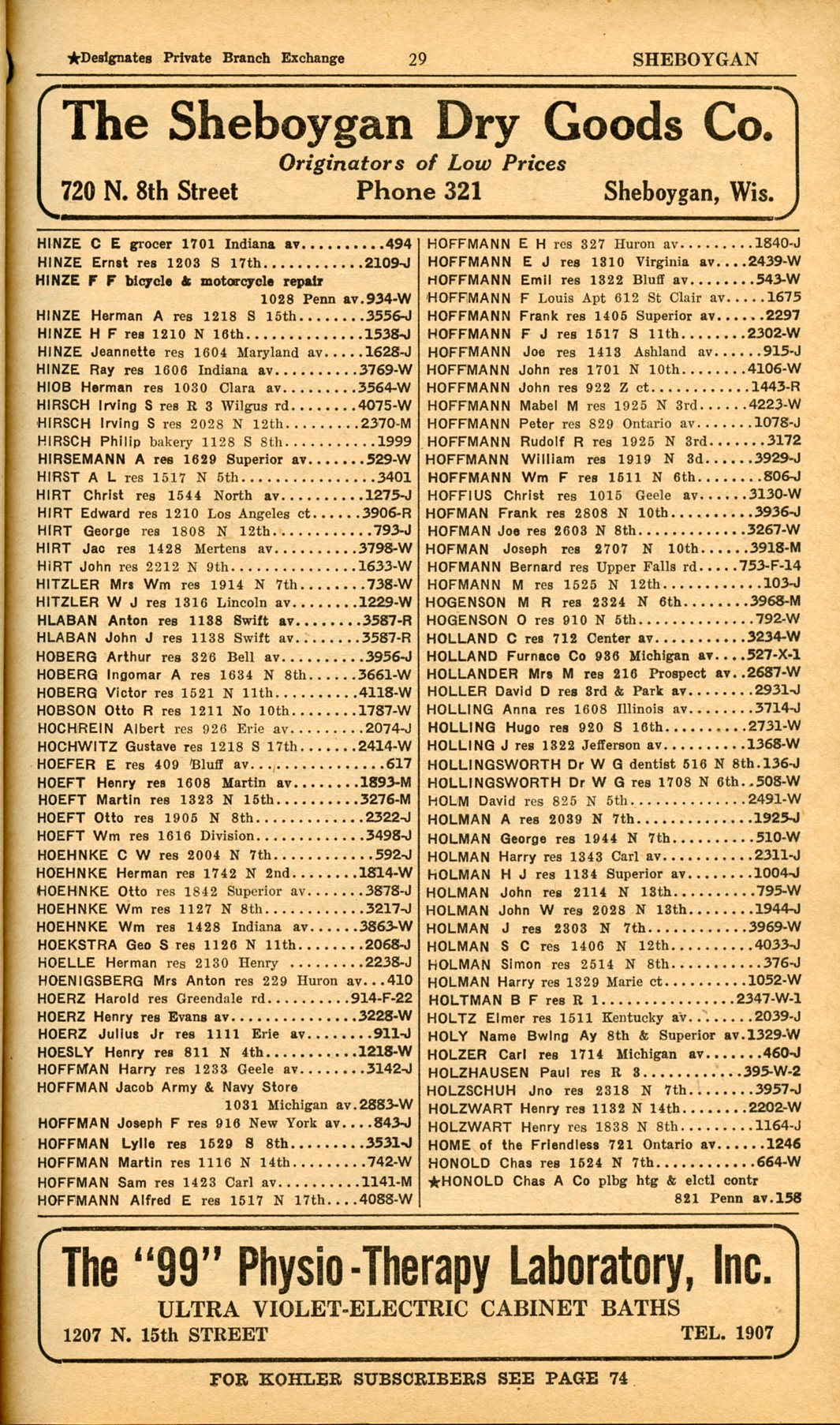 1928 Sheboygan Telephone Book, Page 29: Hinze to Honold