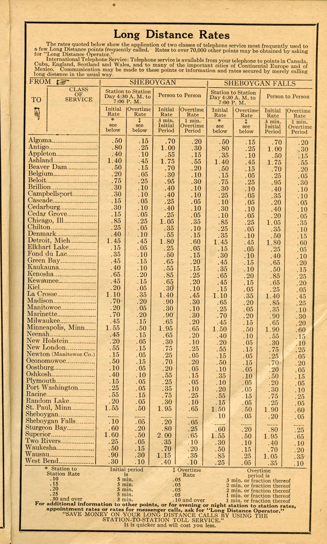 1928 Sheboygan Telephone Book, Page 3: Long Distance Rates