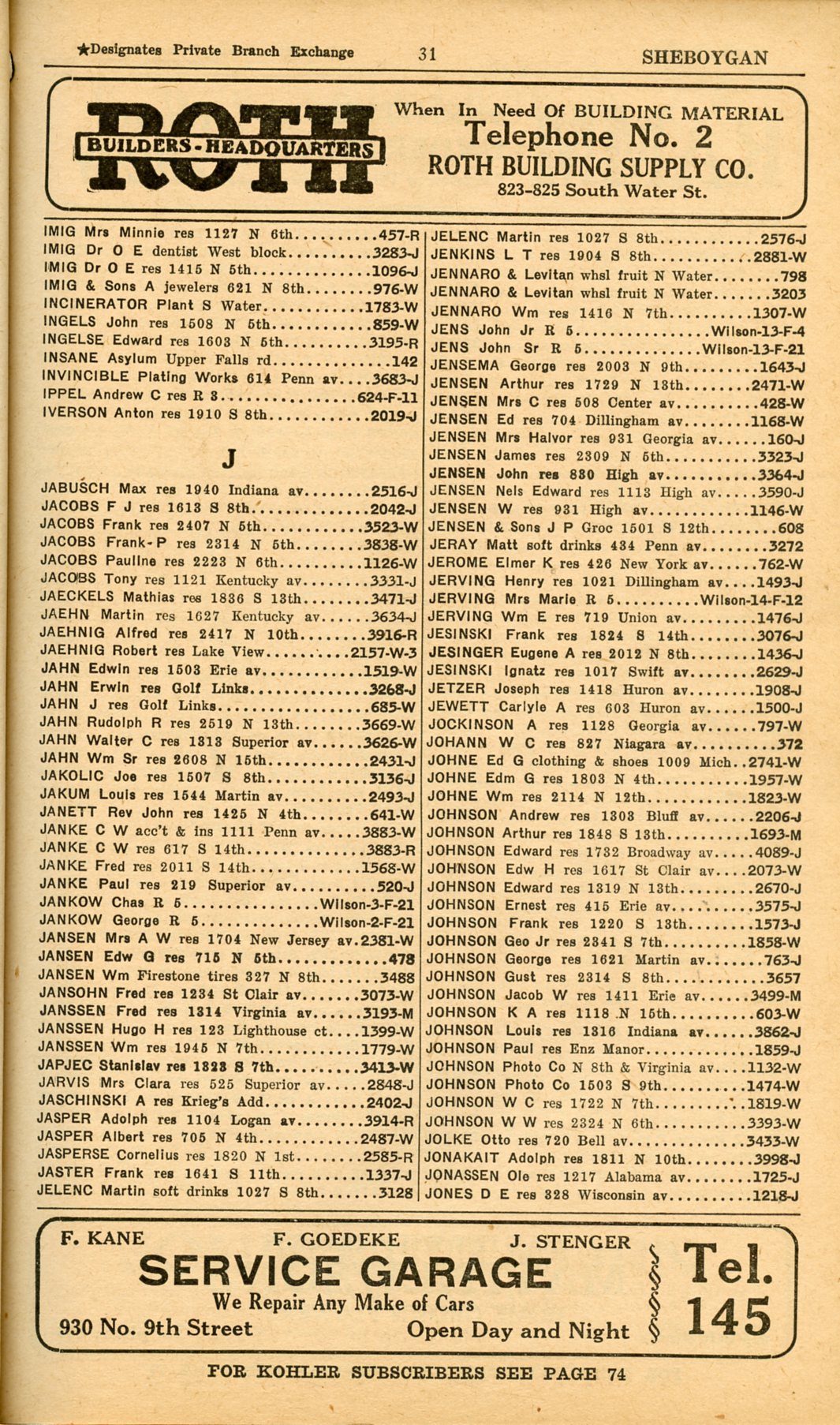 1928 Sheboygan Telephone Book, Page 31: Imig to Jones