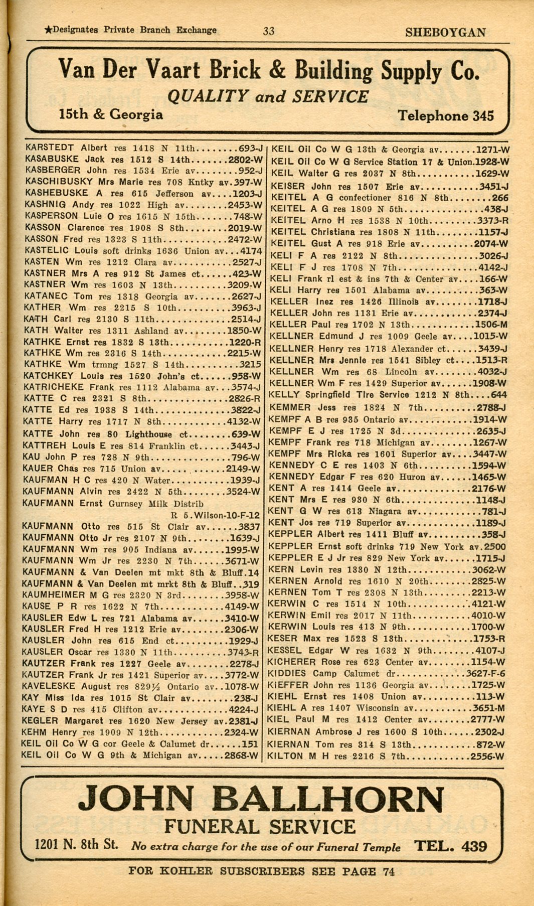 1928 Sheboygan Telephone Book, Page 33: Karstedt to Kilton