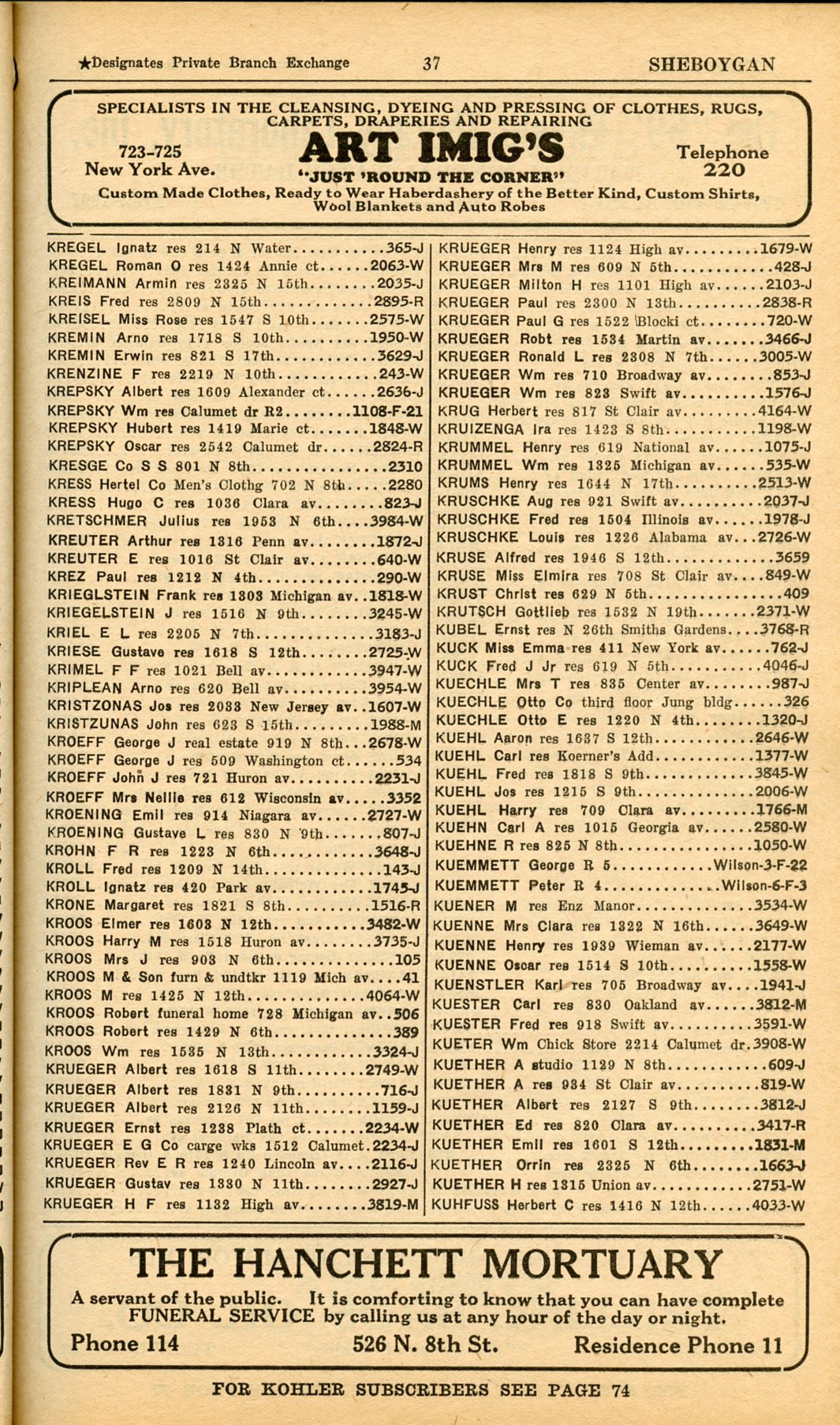 1928 Sheboygan Telephone Book, Page 37: Kregel to Kuhfuss
