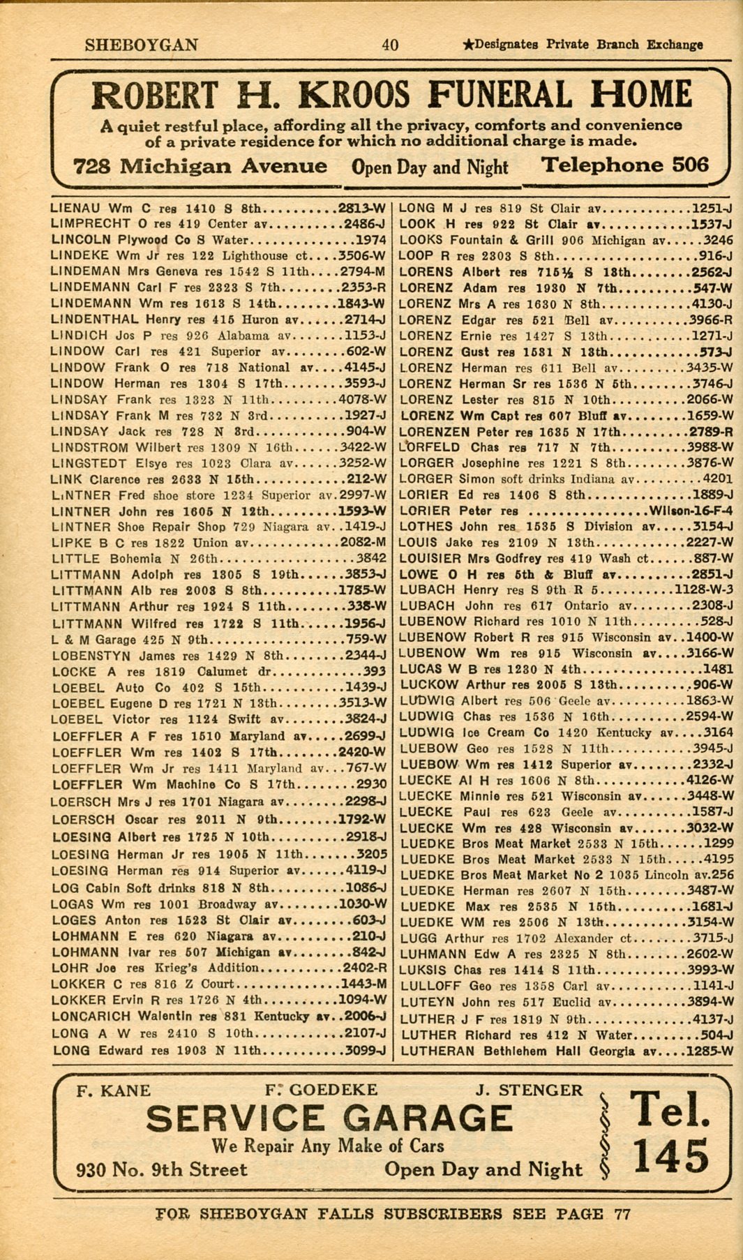 1928 Sheboygan Telephone Book, Page 40: Lienau to Lutheran