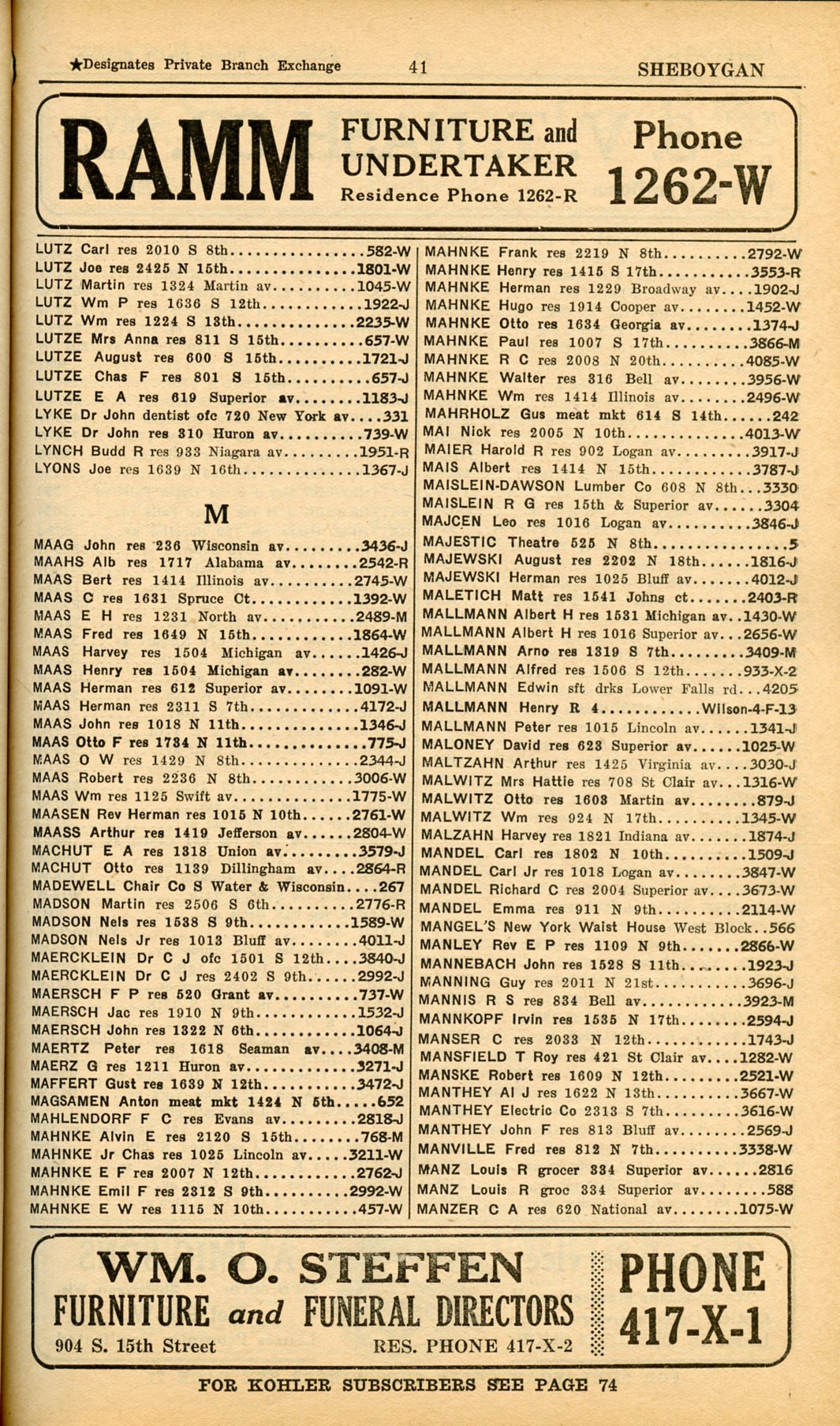 1928 Sheboygan Telephone Book, Page 41: Lutz to Manzer