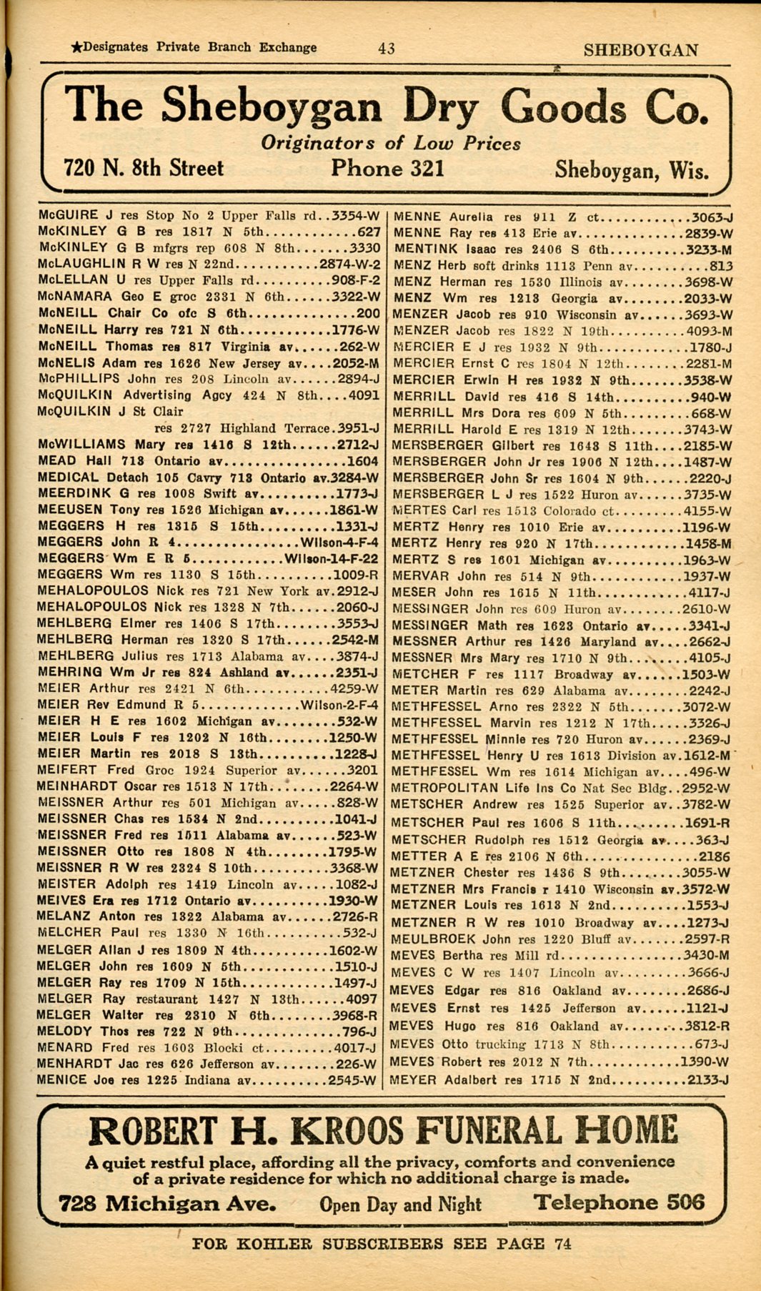 1928 Sheboygan Telephone Book, Page 43: McGuire to Meyer