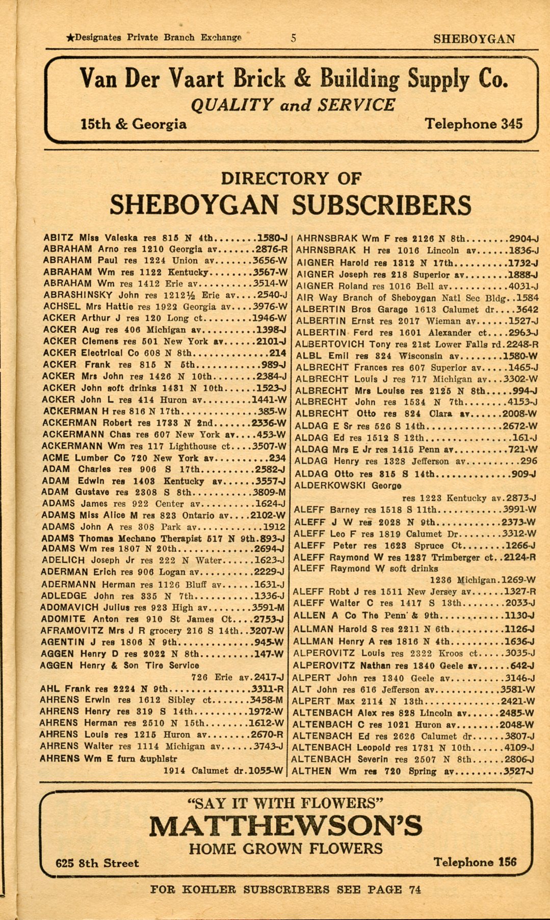 1928 Sheboygan Telephone Book, Page 5: Abitz to Althen