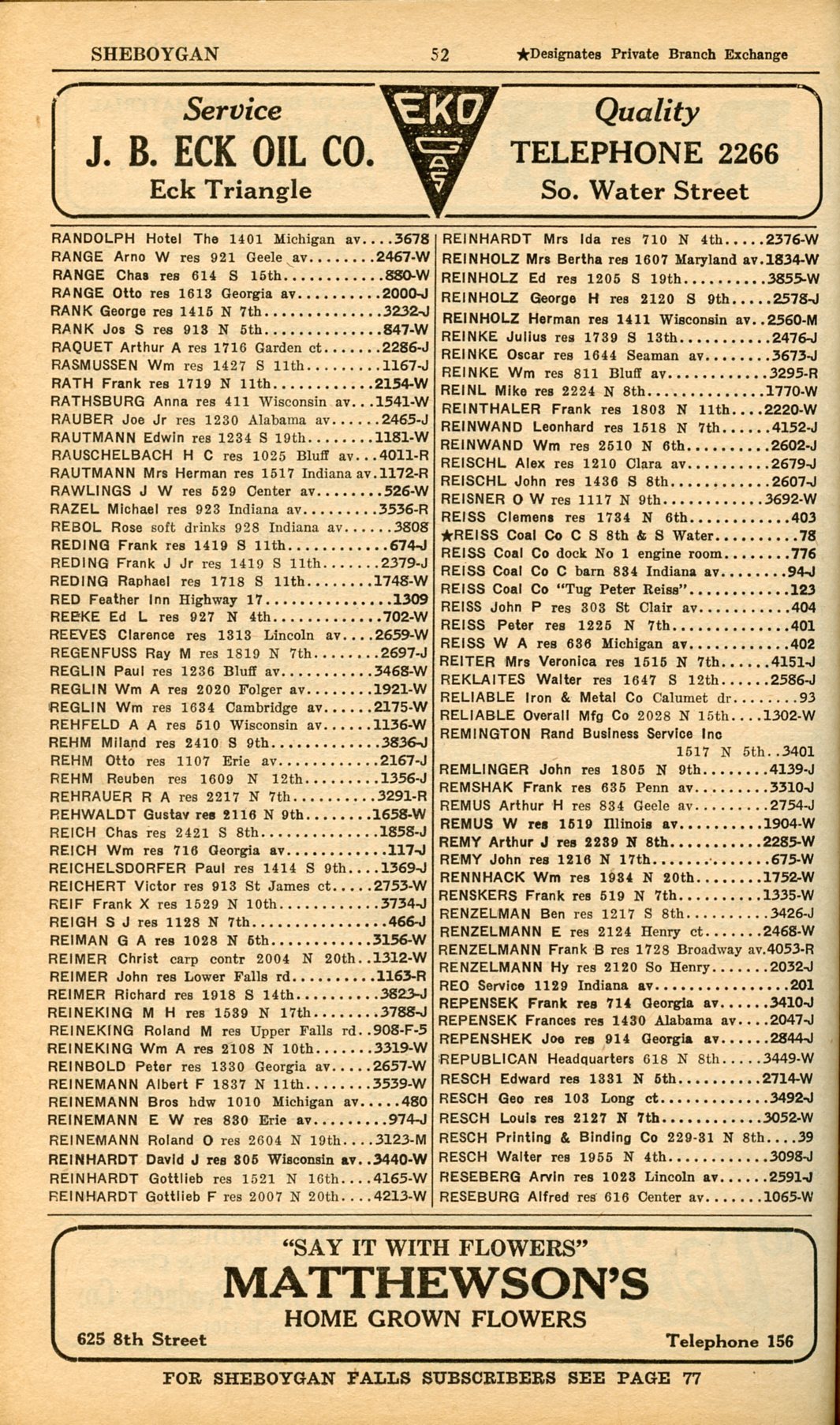 1928 Sheboygan Telephone Book, Page 52: Randolph to Reseburg