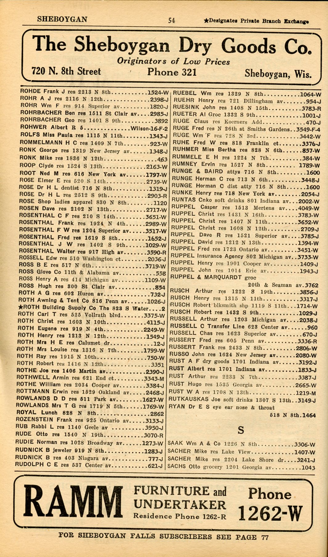 1928 Sheboygan Telephone Book, Page 54: Rohde to Sachs