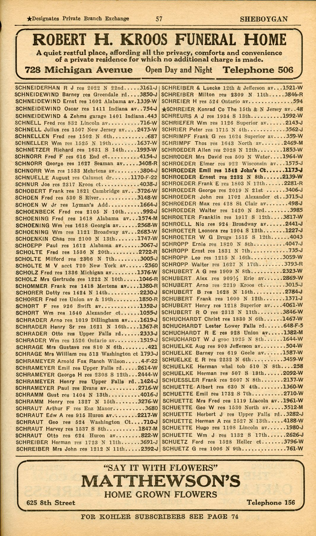 1928 Sheboygan Telephone Book, Page 57: Schneiderhan to Schuetz