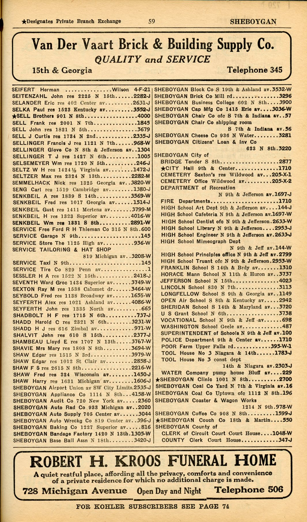 1928 Sheboygan Telephone Book, Page 59: Seifert to Sheboygan