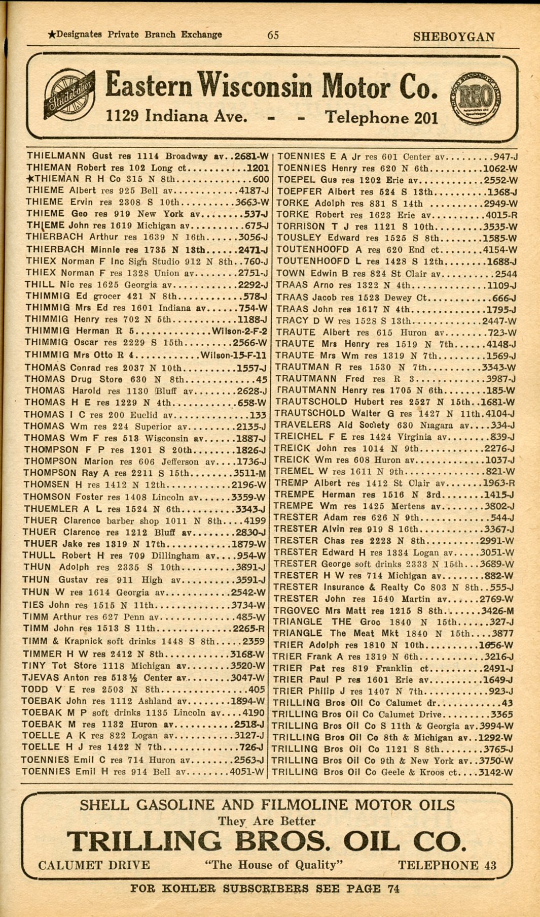 1928 Sheboygan Telephone Book, Page 65: Thielmann to Trilling
