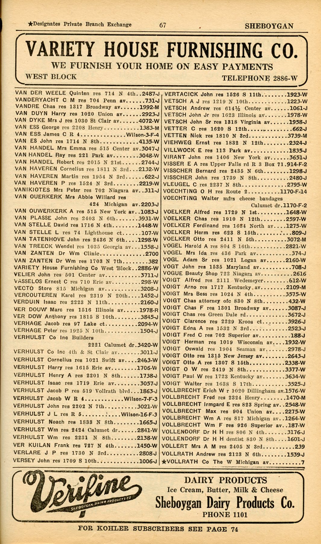 1928 Sheboygan Telephone Book, Page 67: Van Der Weele to Vollrath