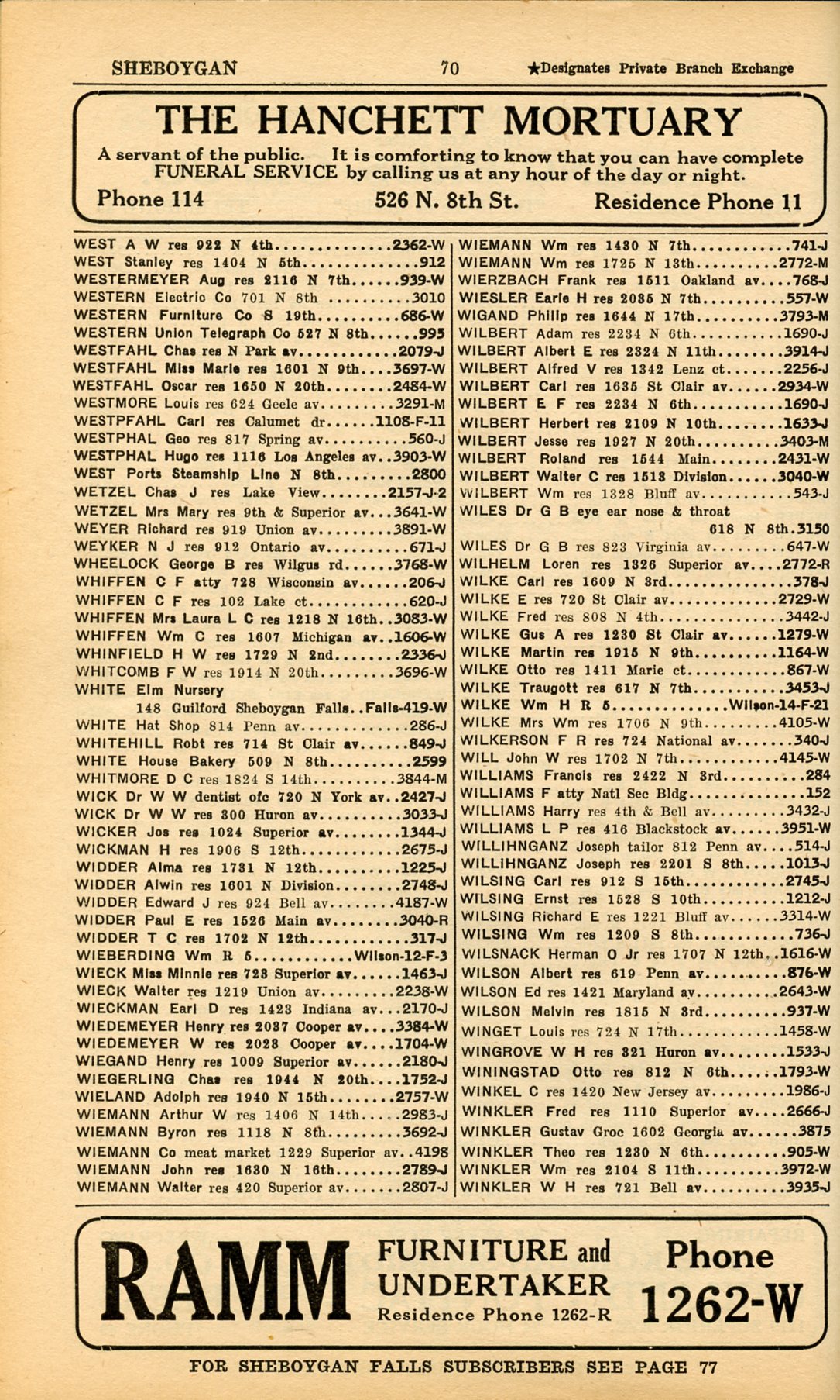 1928 Sheboygan Telephone Book, Page 70: West to Winkler