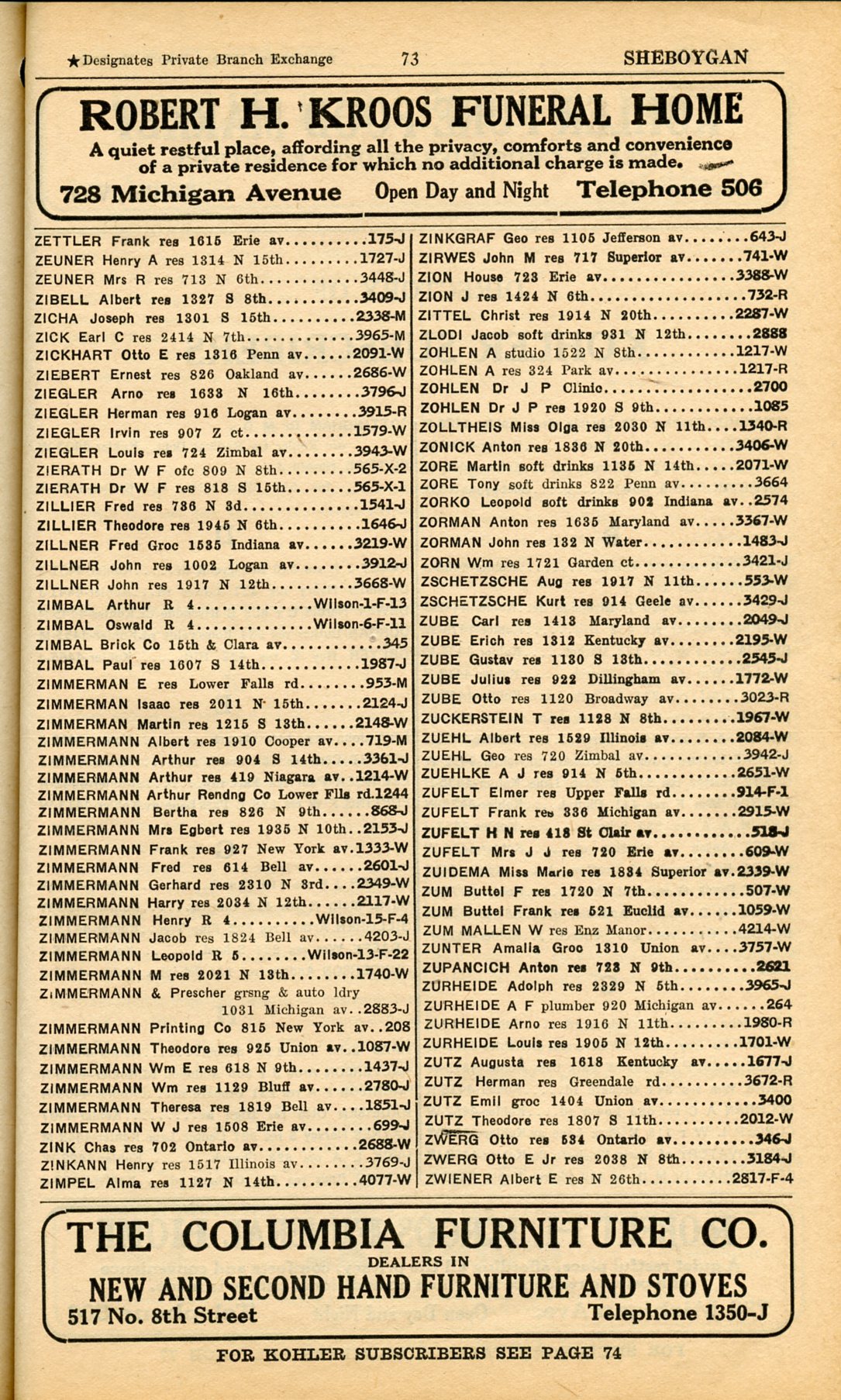 1928 Sheboygan Telephone Book, Page 73: Zettler to Zwiener