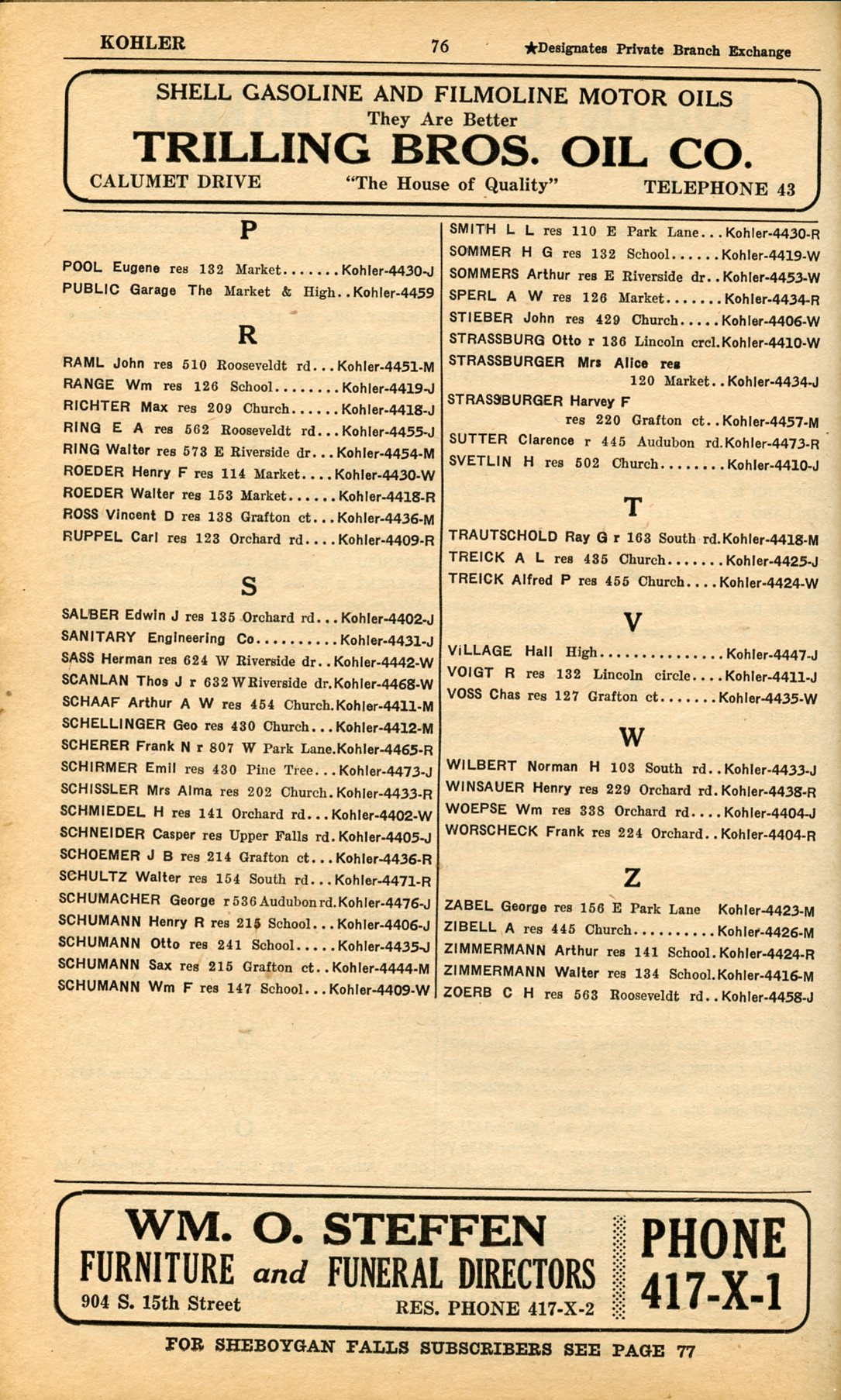 1928 Sheboygan Telephone Book, Page 76, Kohler: Pool to Zoerb