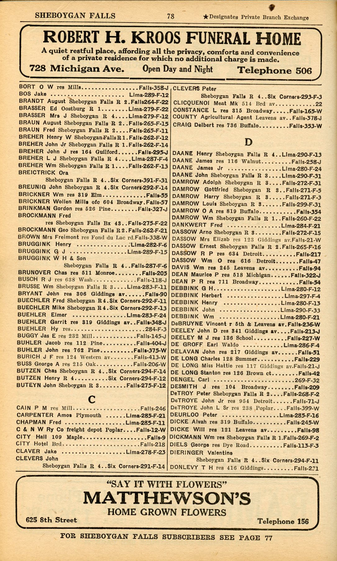 1928 Sheboygan Telephone Book, Page 78, Sheboygan Falls: Bort to Donlevy
