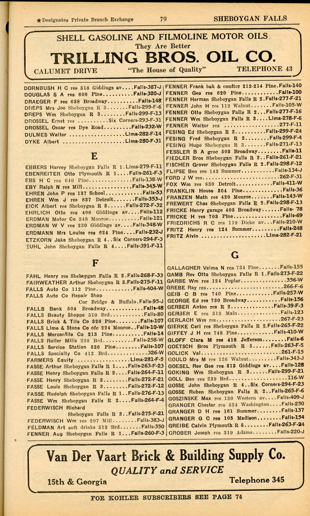 1928 Sheboygan Telephone Book, Page 79, Sheboygan Falls: Dornbush to Grober