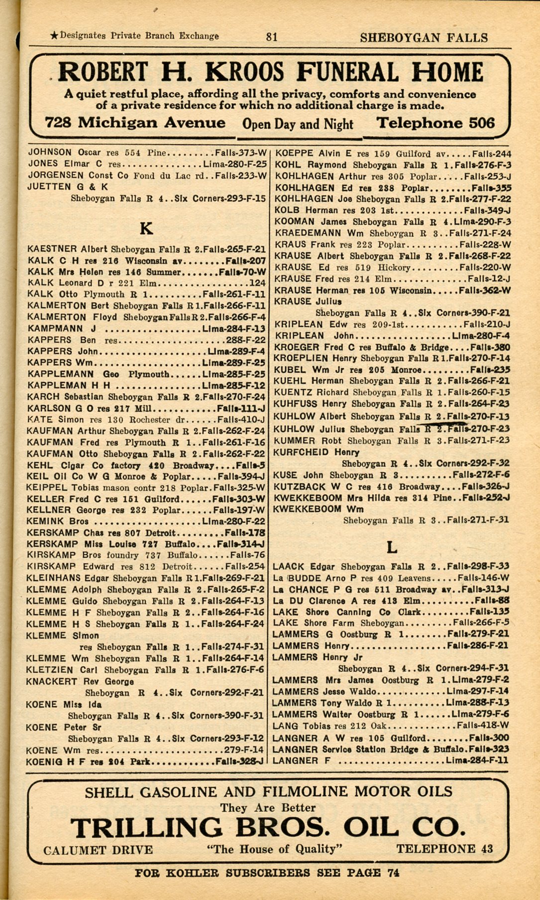 1928 Sheboygan Telephone Book, Page 81, Sheboygan Falls: Johnson to Langner