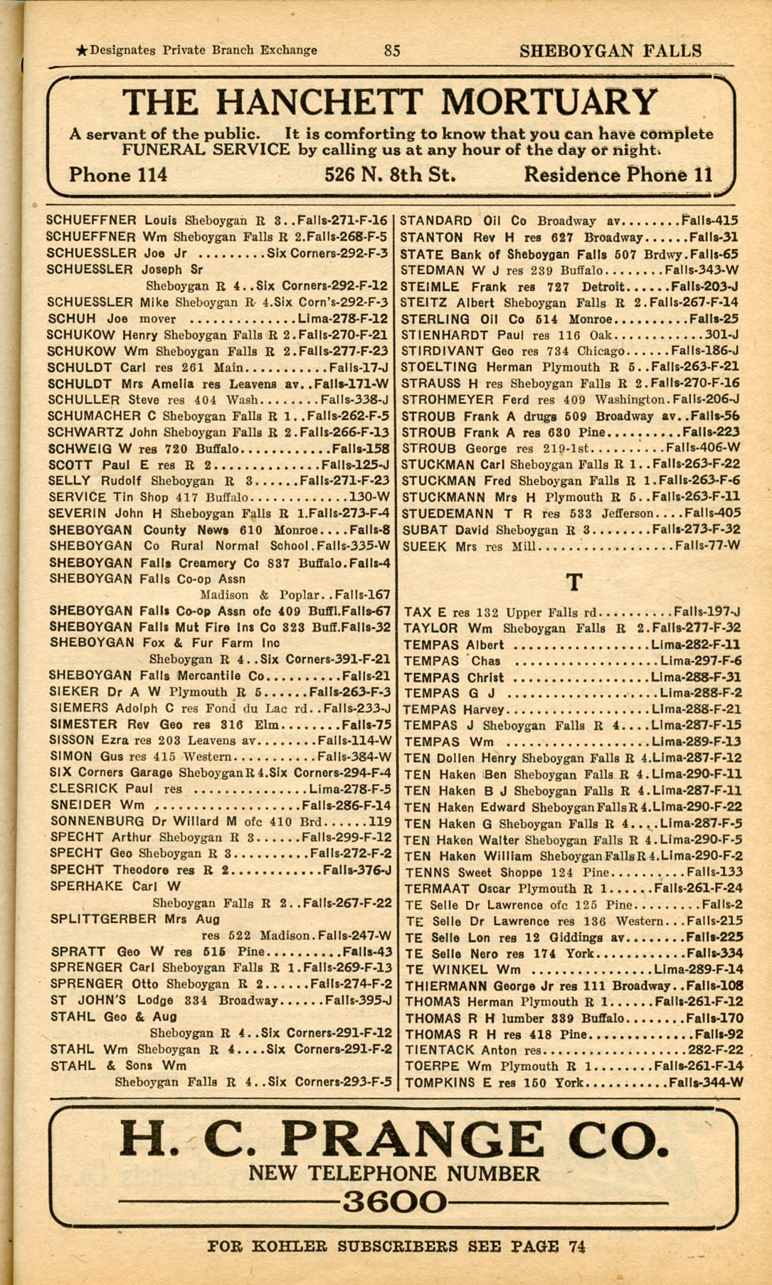 1928 Sheboygan Telephone Book, Page 85, Sheboygan Falls: Schueffner to Tompkins