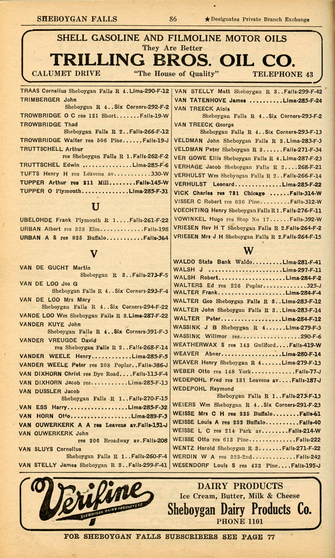 1928 Sheboygan Telephone Book, Page 86, Sheboygan Falls: Traas to Wesendorf