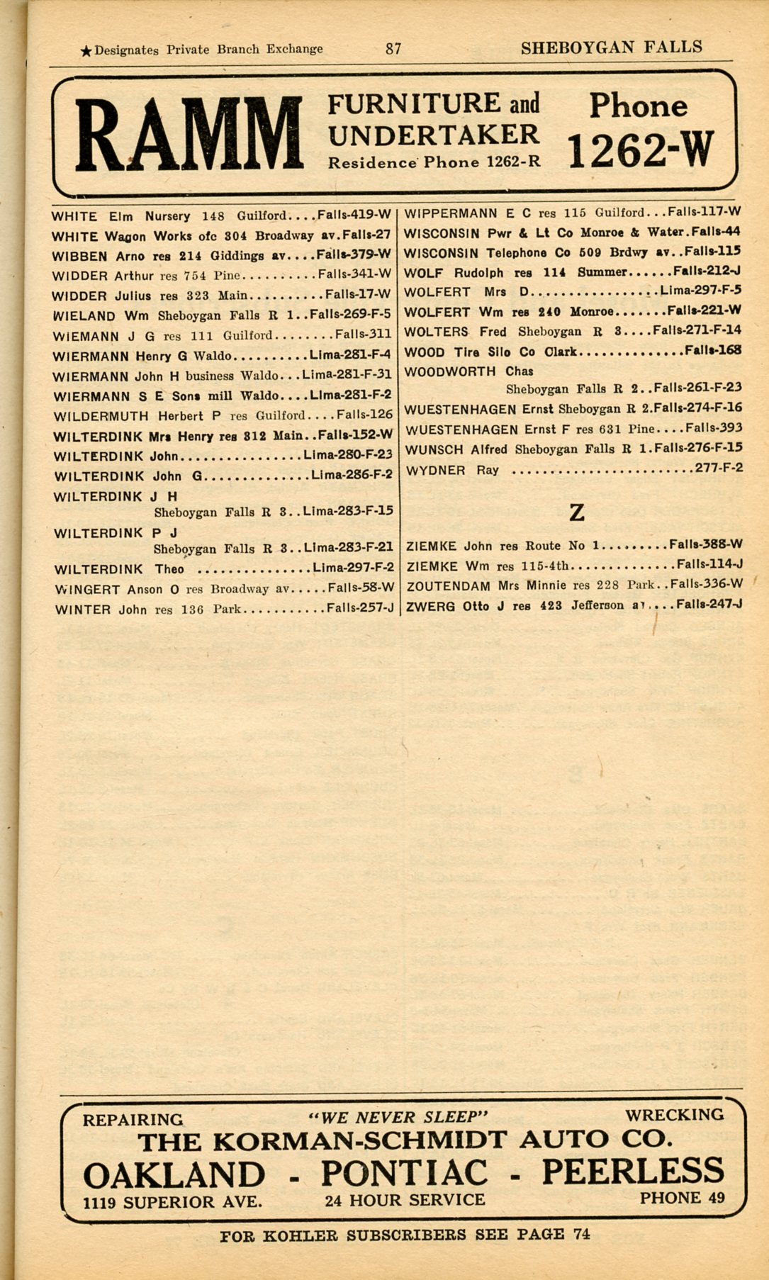 1928 Sheboygan Telephone Book, Page 87, Sheboygan Falls: White to Zwerg