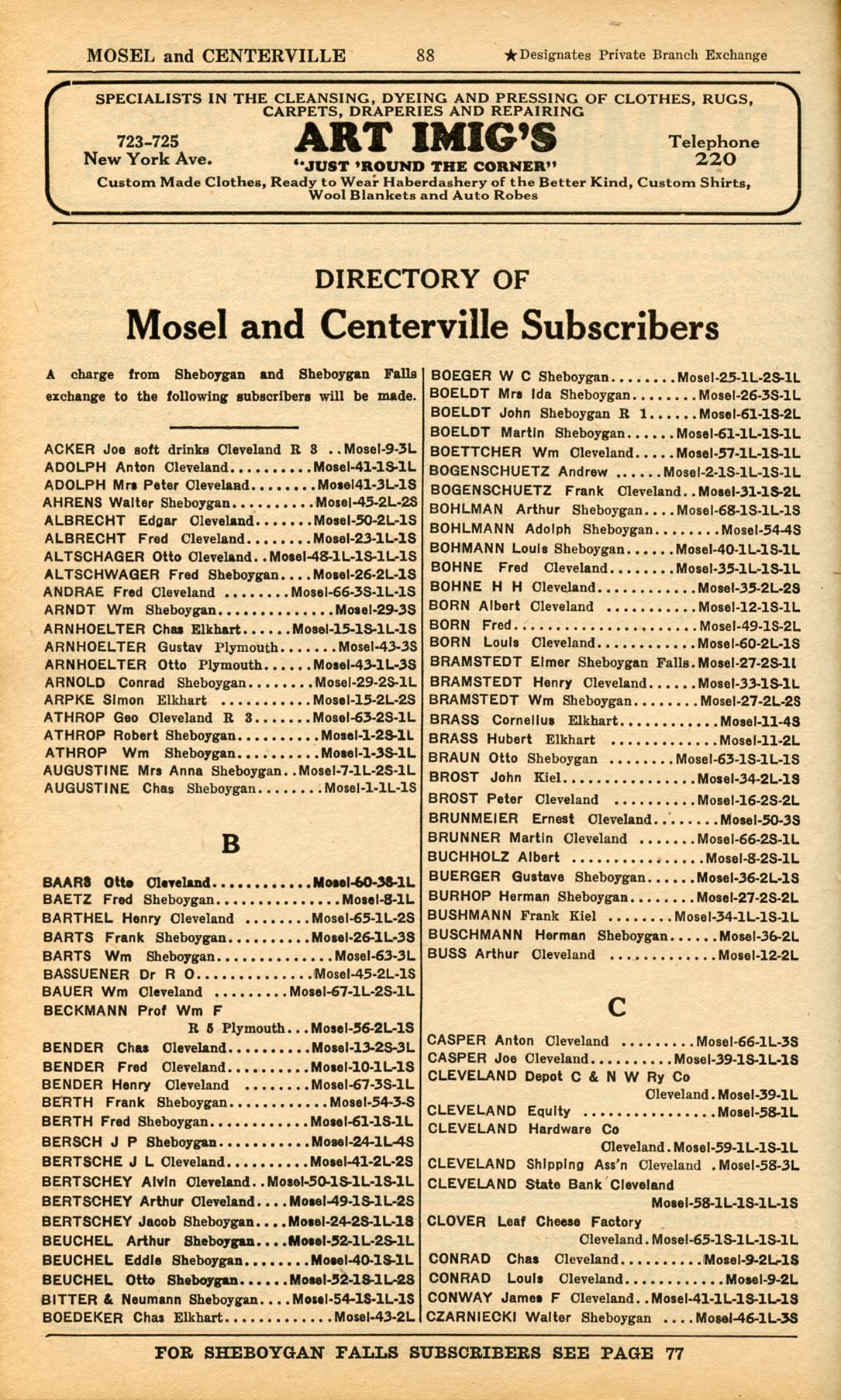 1928 Sheboygan Telephone Book, Page 88, Mosel and Centerville: Acker to Czarniecki
