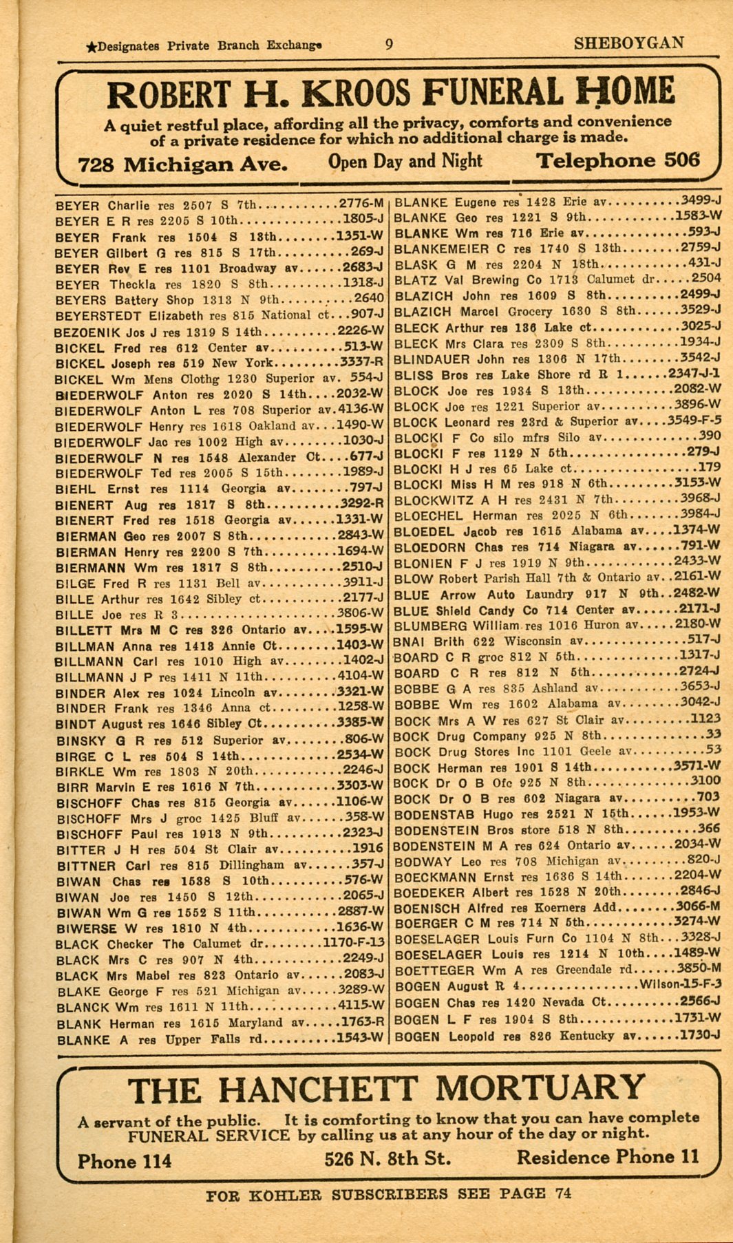 1928 Sheboygan Telephone Book, Page 9: Beyer to Bogen