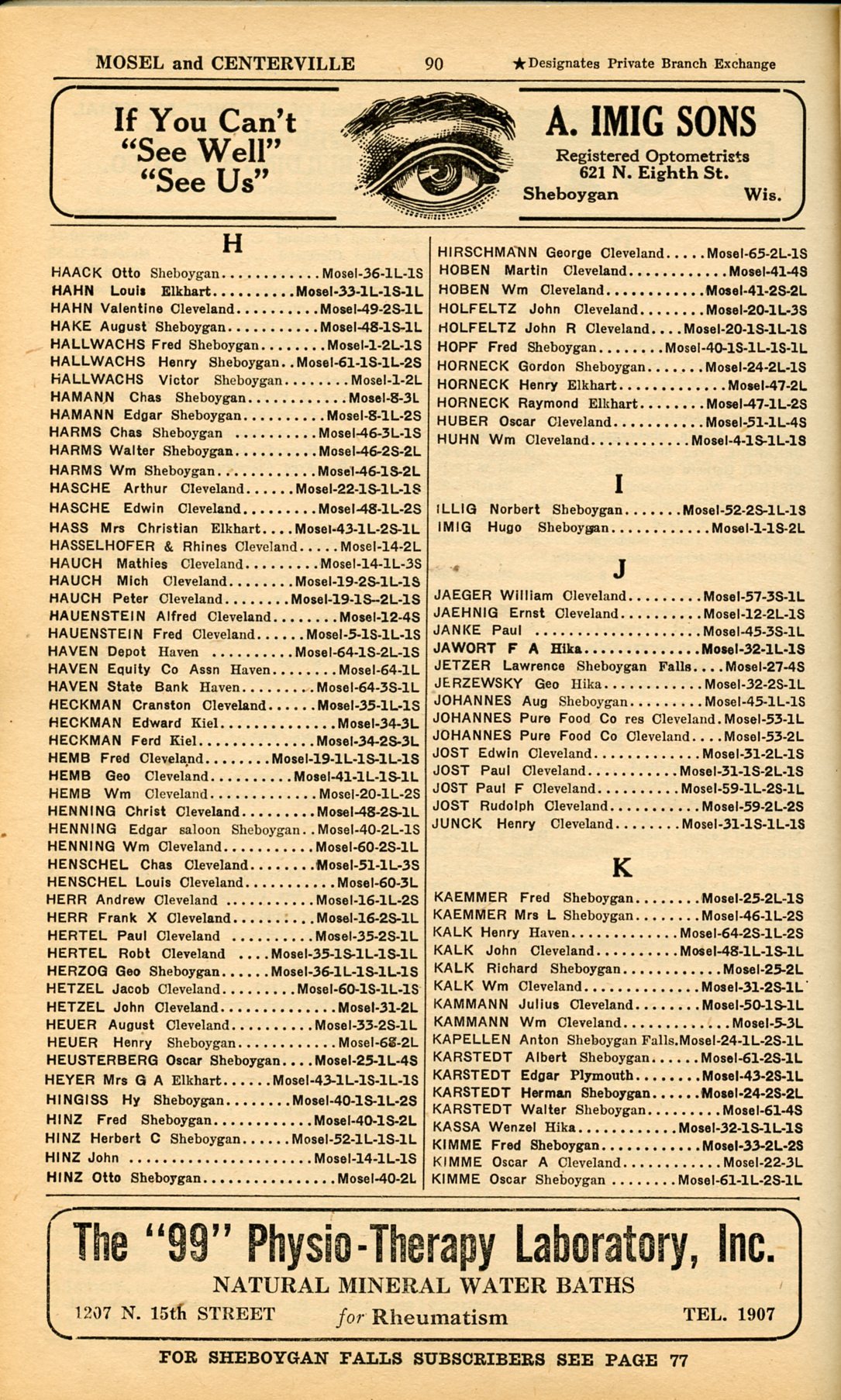 1928 Sheboygan Telephone Book, Page 90, Mosel and Centerville: Haack to Kimme