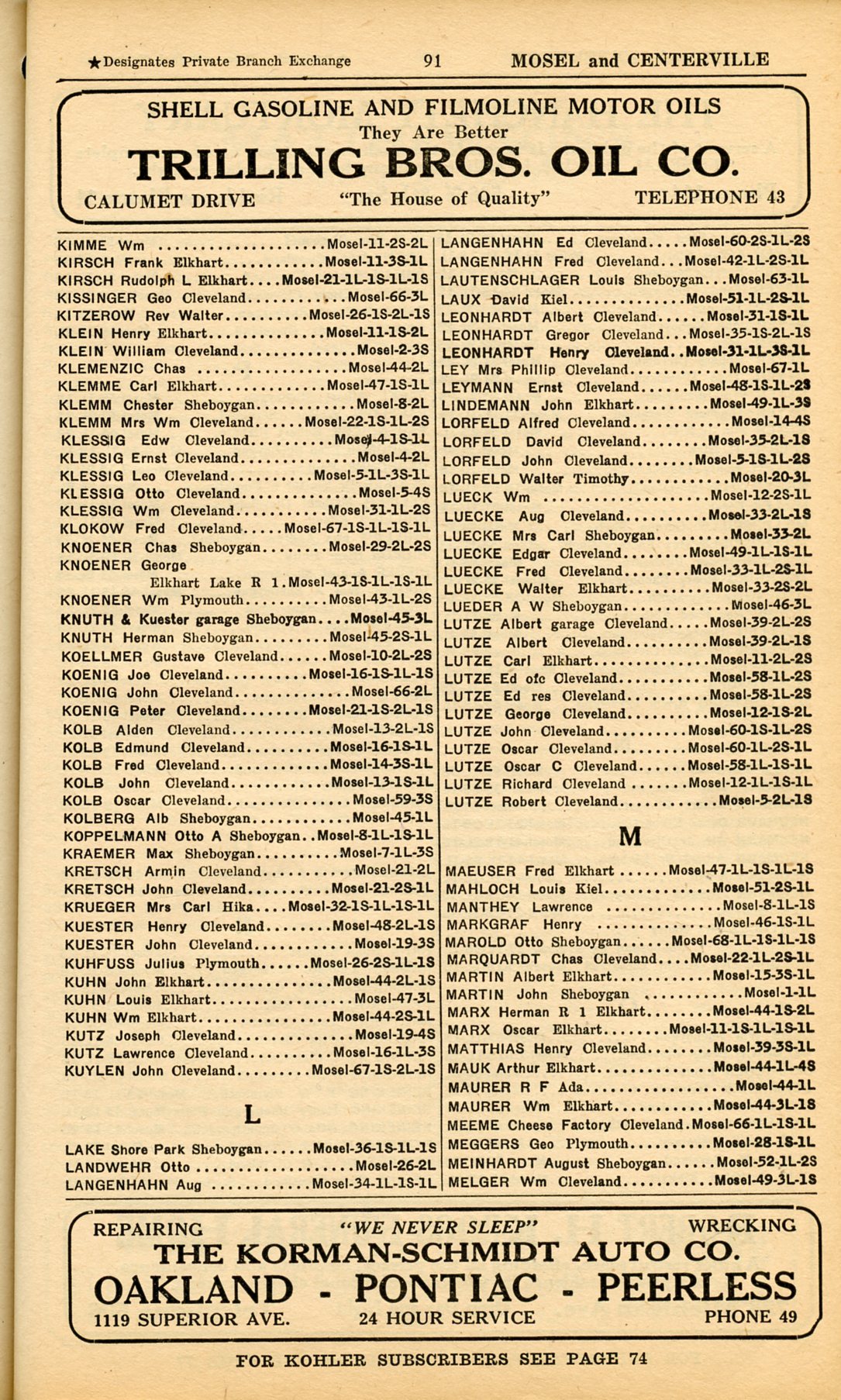 1928 Sheboygan Telephone Book, Page 91, Mosel and Centerville: Kimme to Melger
