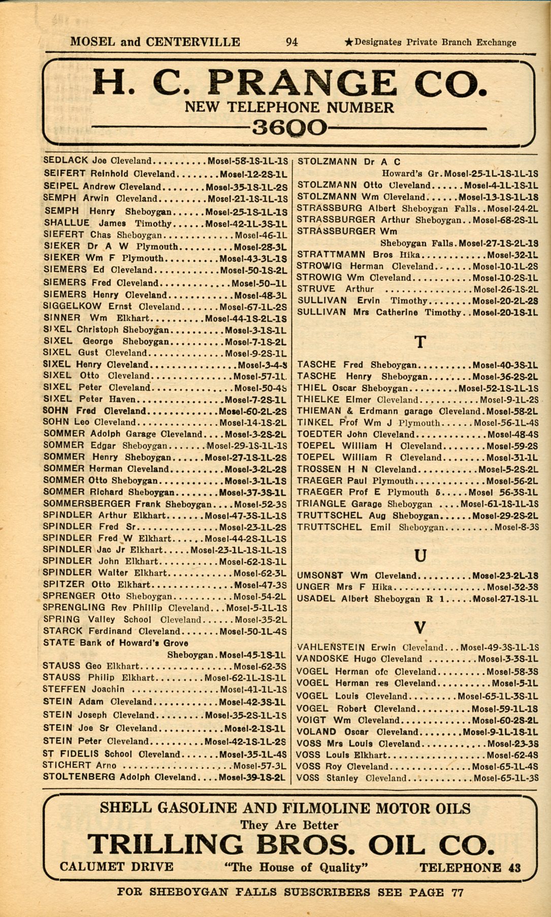 1928 Sheboygan Telephone Book, Page 94, Mosel and Centerville: Sedlack to Voss