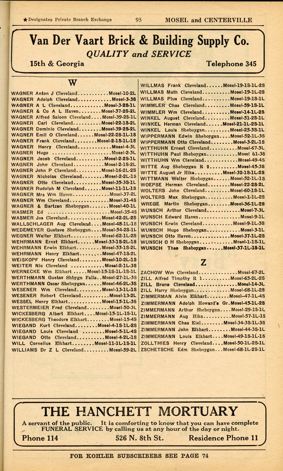 1928 Sheboygan Telephone Book, Page 95, Mosel and Centerville: Wagner to Zschetsche