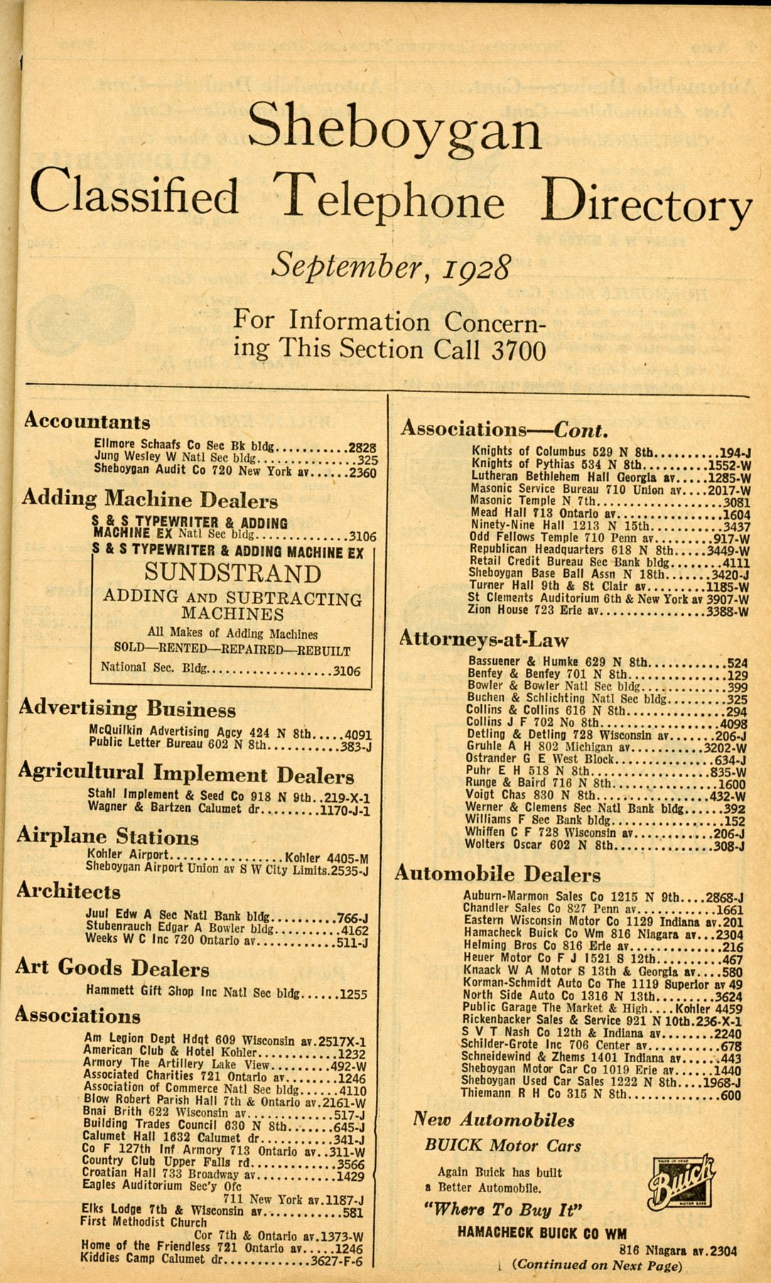 1928 Sheboygan Telephone Book, Page 99, Business Section: Accountants to Automobile Dealers