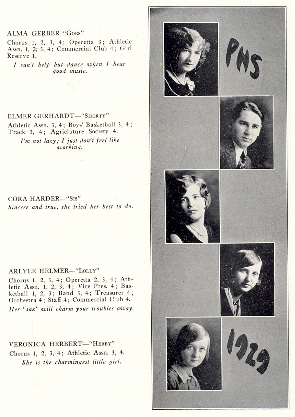 1929 Plymouth High School, Page 15: Alma Gerber, Elmer Gerhardt, Cora Harder, Arlyle Helmer, Veronica Herbert.